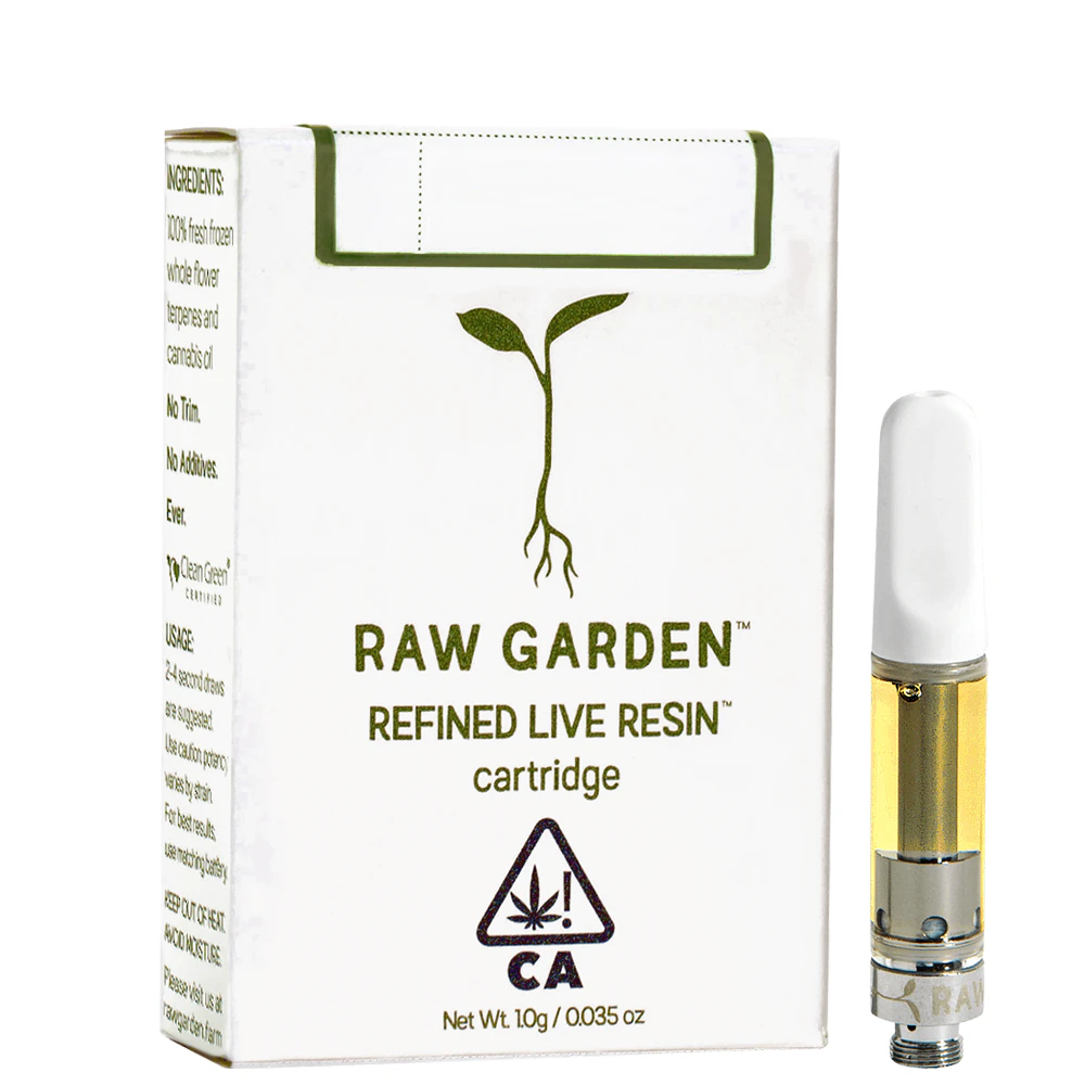 Raw Garden high-potency Refined Live Resin™ THC Vape Cartridges are 100% Cannabis – no additives, fillers, or artificial flavors. Made from Cannabis flower grown by Raw Garden in Central California using entirely organically-based and Clean Green-certified farming techniques that is Cryogenically Flash-Frozen immediately at harvest. These cartridges are high in THC and contain all the natural aromas, flavors, and terpenes of the high-quality source flower from which they are extracted.